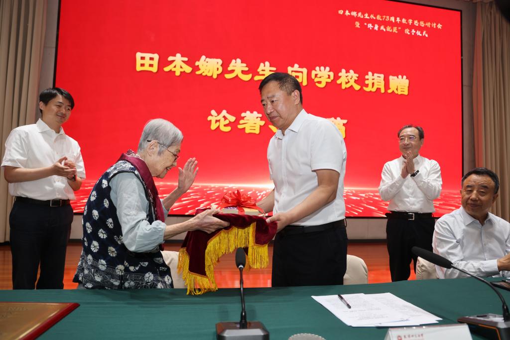 曲凯、巩金龙分别为田本娜先生颁发“终身成就奖”奖牌和50万元奖金。田本娜先生对学校给予的荣誉和奖励以及与会专家的高度评价表达感谢,现场宣布将奖金全部捐赠给学校以奖励优秀教师和学生,并向学校捐赠珍贵论著与手稿。