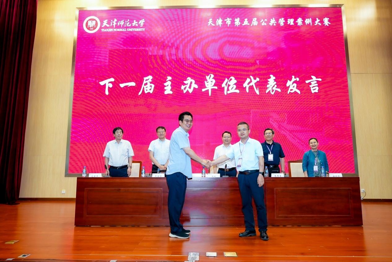 最后,天津市公共管理案例大赛进行了举办单位交接仪式,天津市第六届公共管理案例大赛主办单位代表、河北工业大学人文与法律学院副院长闫文博发言,他对本届大赛的圆满举办表示祝贺,并介绍了下一届赛事的筹备设想,欢迎各高校师生继续关注与参与,共同推动公共管理案例教育教学活动的深入开展。