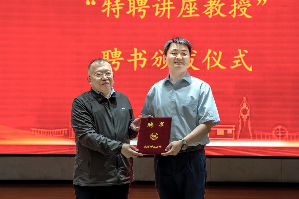 本站讯(通讯员 程娜)6月9日下午,学校举行“特聘讲座教授”聘书颁发仪式暨第104场“求是讲坛”学术报告会,国家图书馆原常务副馆长张志清教授受聘,并以《古籍保护与活化在文化强国建设中的关键作用》为题作学术报告。校党委副书记、校长巩金龙,校党委常委、副校长秦龙出席。天津多所高校图书馆、公共图书馆、天津市档案馆领导同仁,我校相关职能处室、学院、古籍保护相关专业师生代表200余人参加本次活动。