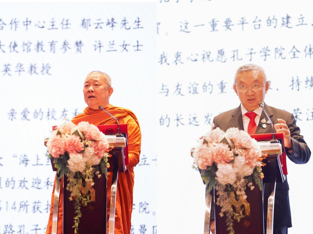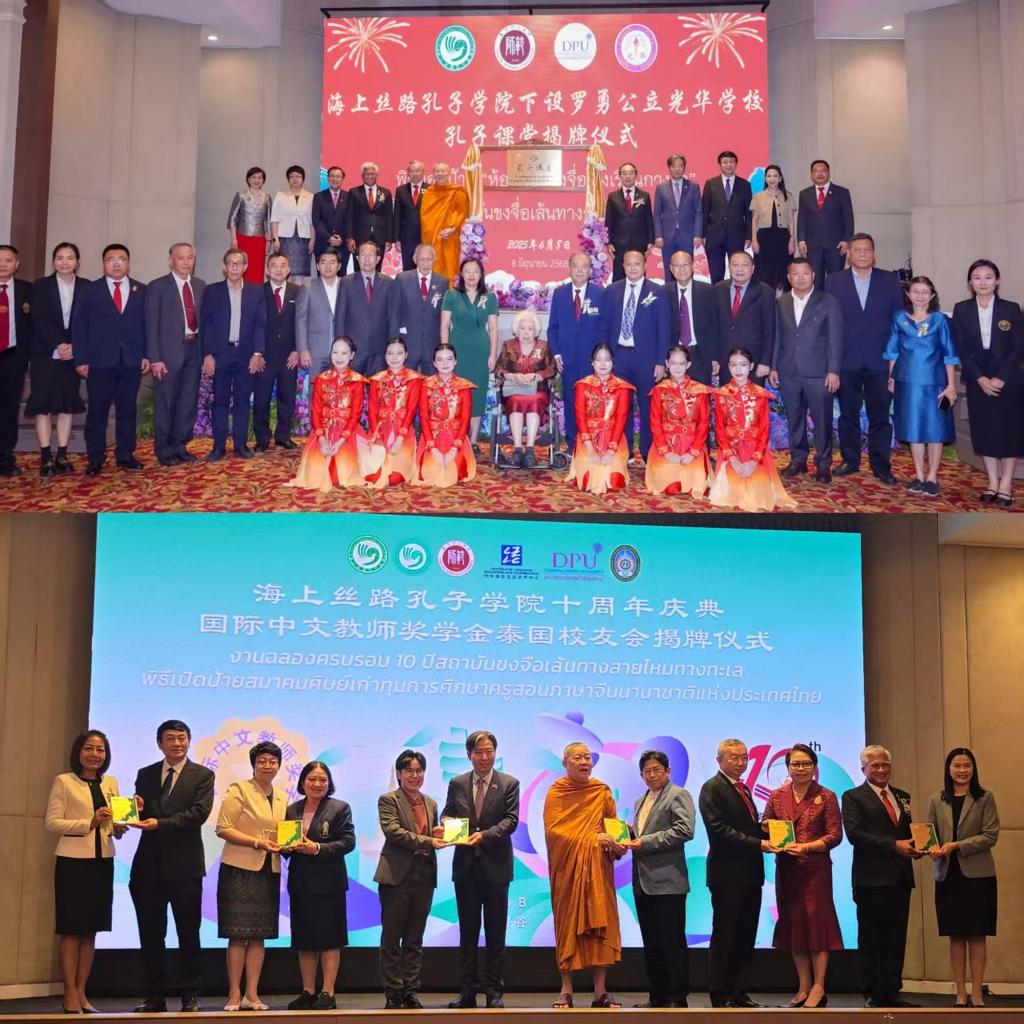 本站讯(通讯员 赵英东)6月8日,我校与泰国博仁大学共建海上丝路孔子学院10周年暨全球首个国际中文教师奖学金校友会成立揭牌仪式在泰国曼谷举行。海上丝路孔子学院泰方理事会主席颂德通猜,泰国教育部部长蓬普·奇措,中国教育部中外语言交流合作中心主任郁云峰,中国驻泰国大使馆教育参赞许兰等出席并致辞。中国驻泰大使韩志强致贺信。泰国社会各界知名人士、大中小学教育机构代表等240人参加。世界汉语教学学会会长、我校部校共建国际中文教育发展研究院长钟英华出席并致辞。