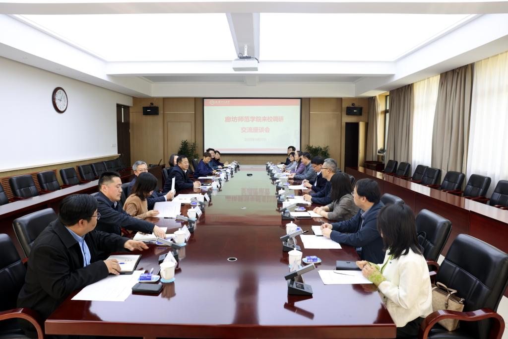 双方与会同志分别就各自领域工作进行“点对点”有针对性的务实交流。廊坊师范学院党政办公室、组织部、人事处、教务处、高等教育研究中心、审计处、发展规划与学科建设处,我校办公室、党委组织部、人事处、教务处、研究生院、合作交流处、审计处有关负责同志参加座谈交流活动。