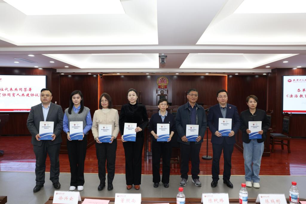 法学院与西青区人民法院、和平区人大小白楼街道工委、天津瑞景中学、天津南开学校鹏飞学校、南开实验学校、西青区精武镇燕南园社区、天津津瑞律师事务所共7家单位共同签署《法治教育协同育人共建协议》。
