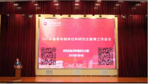 本站讯(通讯员 徐梅芳)为适应时代发展对人才培养的需求,深入贯彻落实学校新学期工作部署会精神,贯彻《中华人民共和国学位法》核心要义,进一步完善学位制度,保障学位质量,推动学科建设与研究生教育事业内涵式发展,学校于3月4日召开 2025 年春季学期学位与研究生教育工作会议。校党委常委、副校长佟德志,各学部(院)部 (院) 长、分管研究生教育的副部(院)长、研究生秘书、研究生导师代表、研究生代表,教务处相关负责同志以及研究生院全体同志参会。