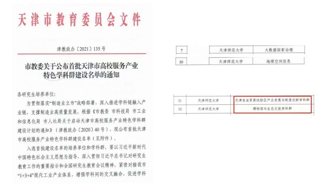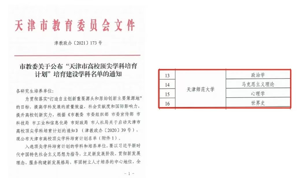 坚持“四个面向”,结合学校实际,优化学科体系,推动学科整体实力持续提升。2023年,政治学、心理学、马克思主义理论、世界史4个学科入选天津市高校顶尖学科培育计划建设学科;地理空间信息、大数据国家治理于2021年,天津自由贸易试验区产业发展与制度创新、博物馆与生态文旅于2023年分别入选天津市高校服务特色产业学科群。