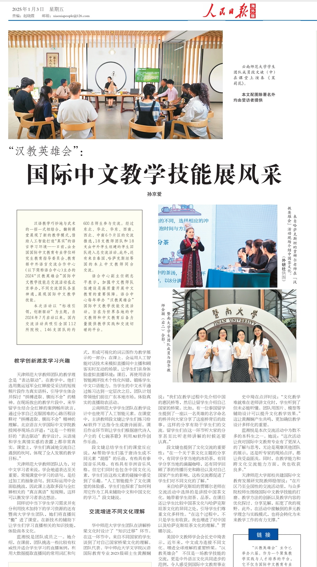 “汉教英雄会”是国际中文教育领域最具品牌影响的教学技能竞技盛会。本届“汉教英雄会”以“标准引领,创新驱动”为主题,吸引全国112所院校的146支团队的600多名师生参赛,经过东北、华北、华东、西南、西北、中南6个片区的交流比武和全球21个国家近400名本土中文教师的竞逐比拼,我校师生团队分别获得2024“汉教英雄会”华北区“最佳教学设计团队”“最佳教学组织团队”及全国仅18支团队获奖的“最佳教学组织团队”及全国“最佳教学组织奖”和“最佳教师风采奖”。师生团队还受到人民日报海外版采访报道。