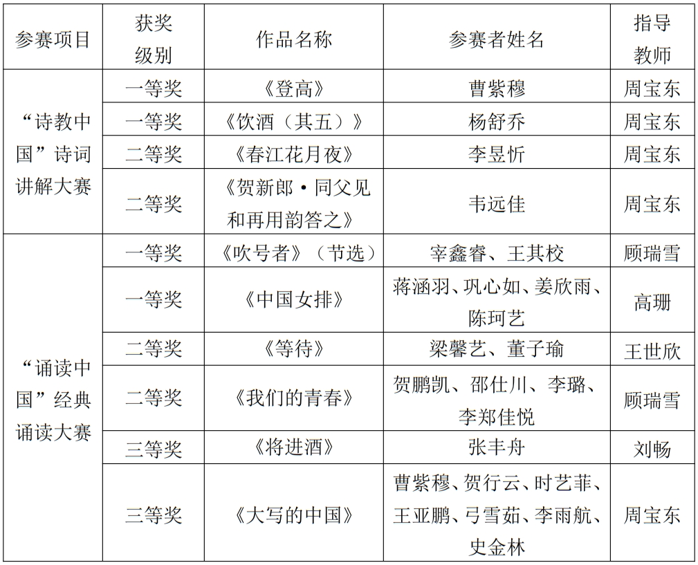 教务处消息(通讯员 李倩 徐墨瑄)近日,天津市教育委员会、天津市语言文字工作委员会公布了第六届中华经典诵写讲大赛天津赛区比赛成绩,我校学生在“诗教中国”诗词讲解大赛大学生组中获得一等奖2项,二等奖2项,位居全市高校第二;在“诵读中国”经典诵读大赛大学生组中获得一等奖2项,二等奖2项,三等奖2项,位列全市高校第三。