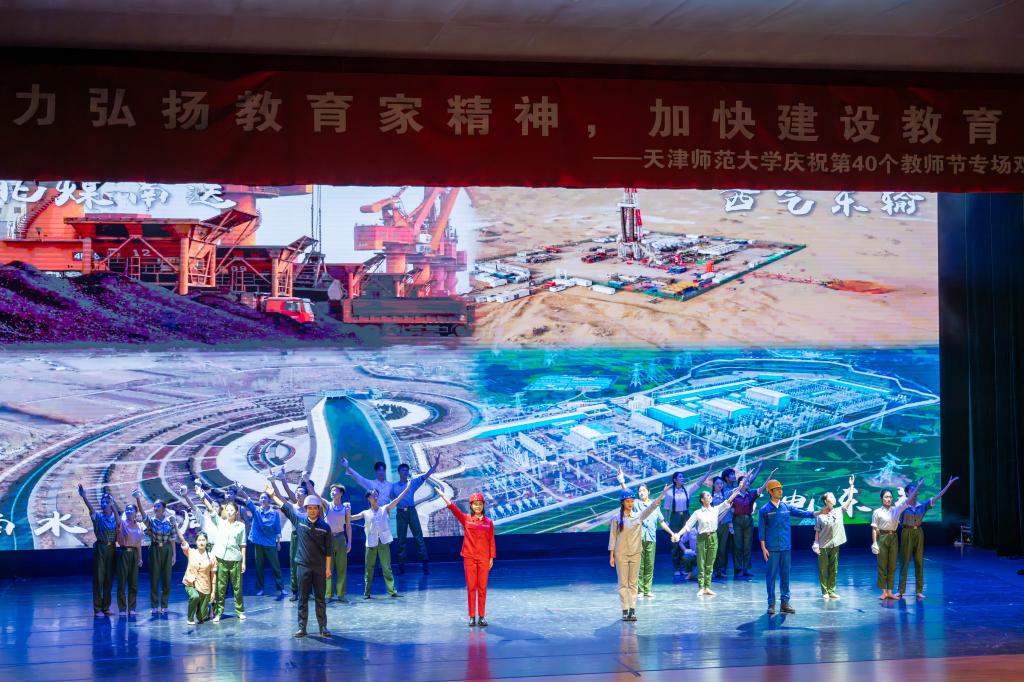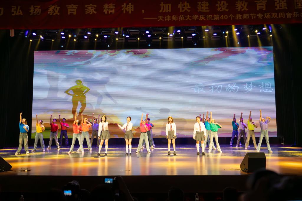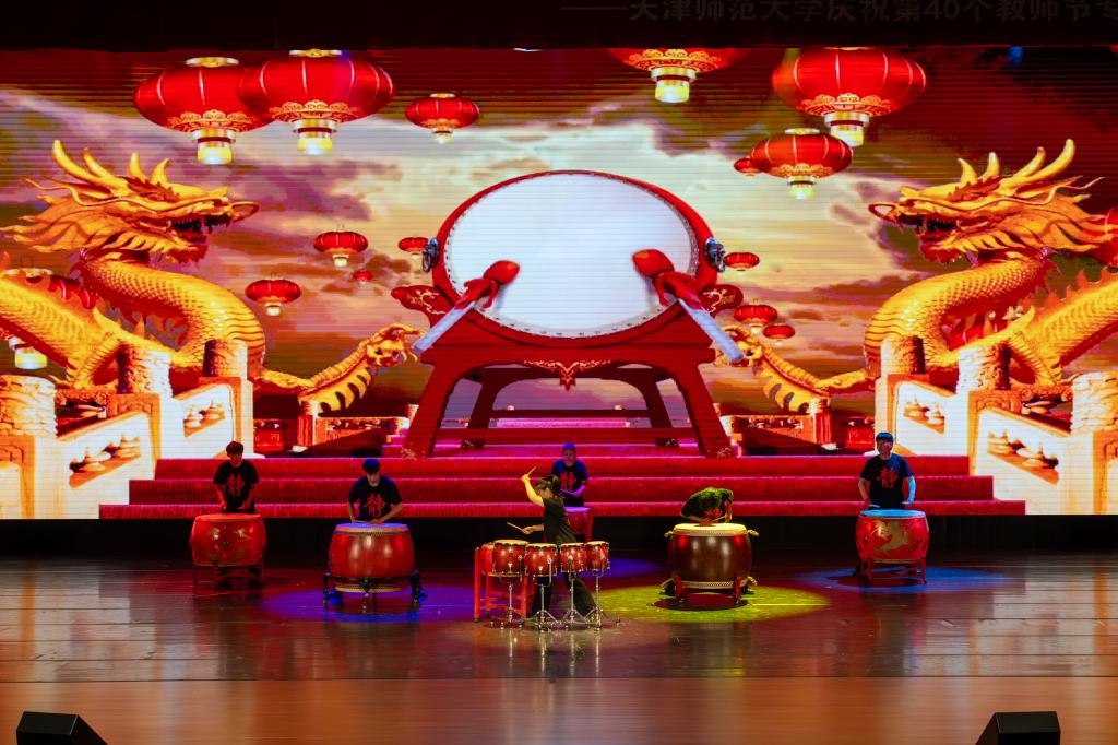激昂振奋的鼓乐响起,中国大鼓及排鼓音色和节奏拉开了气势欢腾的晚会大幕。“因为我们是一家人,相亲相爱的一家人,有福就该同享,有难必然同当…… ”,歌舞《相亲相爱一家人》给全场带来了家一般的温暖,师生同心同力共庆教师节。