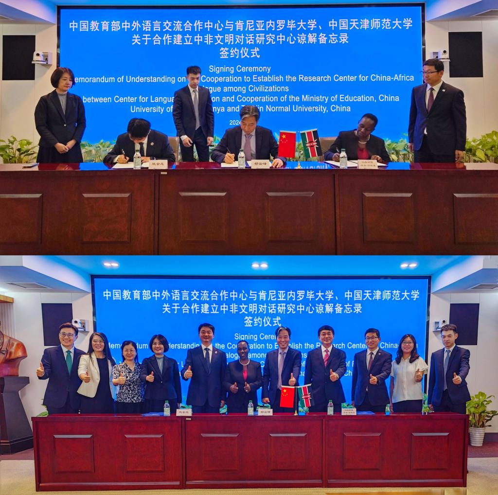 揭牌仪式前,教育部语合中心主任郁云峰同巩金龙、玛格丽特·杰桑·哈钦森共同签署三方合作建立“中非文明对话研究中心”谅解备忘录,钟英华及有关部门负责同志共同参加签约仪式。