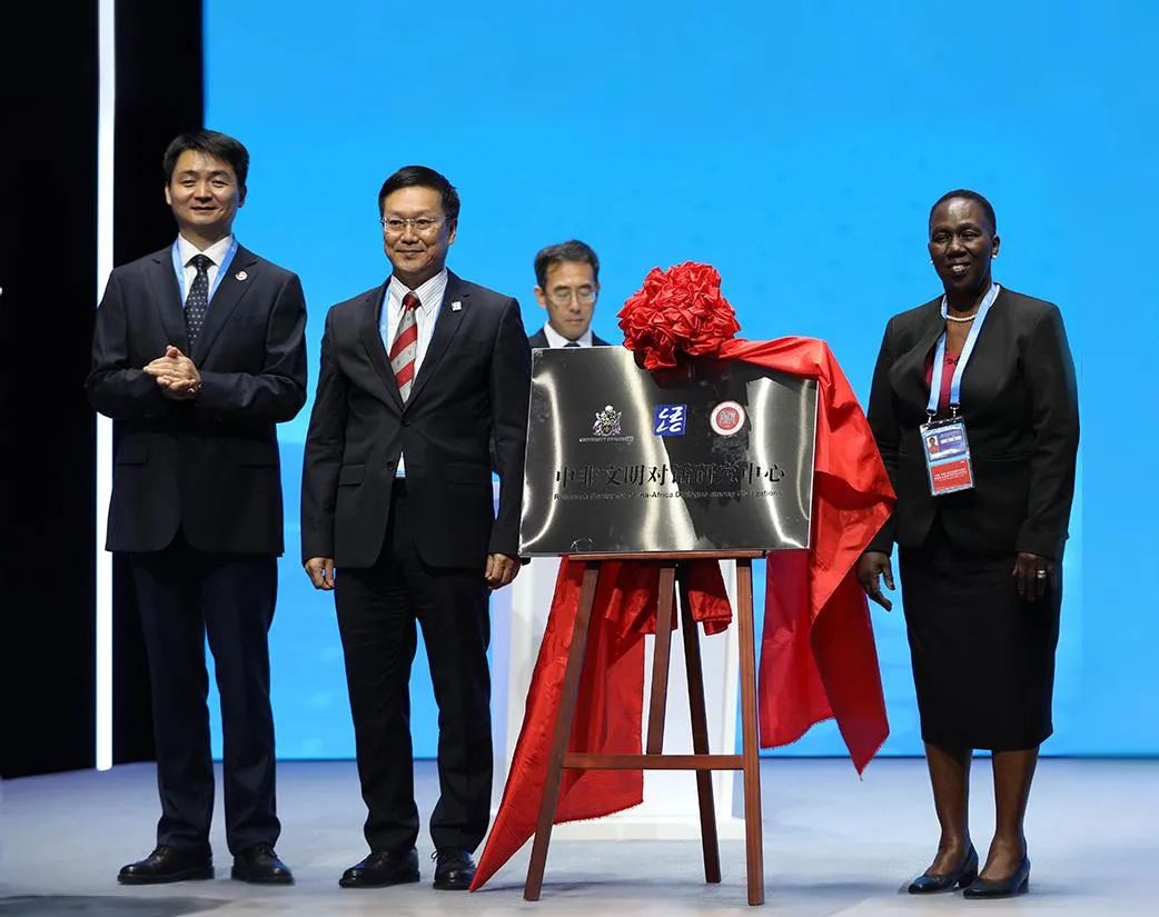 大会揭牌仪式环节,教育部中外语言交流合作中心副主任胡志平与巩金龙、玛格丽特·杰桑·哈钦森共同为三方合作共建的“中非文明对话研究中心”揭牌。