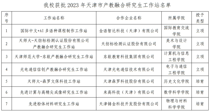 研究生院消息(通讯员 徐梅芳)近日,市教委发布《关于公布2023年天津市产教融合研究生工作站评选结果的通知》(津教研函〔2024〕1号),我校申报的“国际中文+AI多语种课程制作工作站”等4个工作站获批立项建设,“先进计算与高精尖成像研究生工作站”等3个工作站入围培育名单。