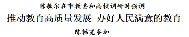 在市教委,陈敏尔听取市委教育工委、市教委工作情况汇报,与班子成员座谈交流,对近年来全市教育系统工作取得的成绩给予肯定。他强调,教育是国之大计、党之大计。要深入学习贯彻习近平总书记关于教育的重要论述和视察天津重要讲话精神,全面贯彻党的教育方针,以坚持党对教育事业的全面领导为根本保证,以服务中华民族伟大复兴为重要使命,以教育理念、体系、制度、内容、方法、治理现代化为基本路径,努力办好人民满意的教育。要落实立德树人根本任务,推进大中小学思想政治教育一体化建设,坚持不懈用习近平新时代中国特色社会主义思想铸魂育人,引导学生永远听党话、跟党走,矢志奉献国家和人民,努力培养德智体美劳全面发展的社会主义建设者和接班人。要认真研究教育发展各个环节,加强教材建设和管理,提升教师专业素养和育人能力,推进各级各类教育高质量发展,在更高水平上满足人民群众对教育的需求。要坚持教育科技人才一体化发展,探索产学研协作新模式,加强关键核心技术攻关,推进新工科建设,优化学科专业体系,深化职普融通、产教融合、科教融汇,推动科教兴市人才强市行动取得更大成效。要加强党对教育工作的全面领导,持续推进党的建设,完善高校党委领导下的校长负责制和党组织领导下的中小学校长负责制,建强领导班子和干部队伍,强化师德师风建设,筑牢校园安全防线,组织开展好党纪学习教育,持续推动全面从严治党向纵深发展,确保教育领域始终成为坚持党的领导的坚强阵地。
