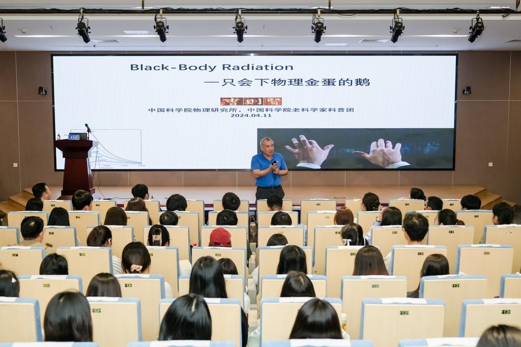 成立大会后,京津冀物理科普教育基地联盟开展了系列活动。联盟“科普大使”曹则贤以《黑体辐射:一只会下物理金蛋的鹅》为题,为师生们带来了精彩的物理科普教育主题报告。黑体辐射研究在理论物理领域具有重要地位,曹老师通过深入浅出的方式,生动形象地带领师生们梳理了黑体辐射研究的历史逻辑,展现了学问创造者的思想历程,为师生们提供了一次多维度、全景式的物理学习体验。