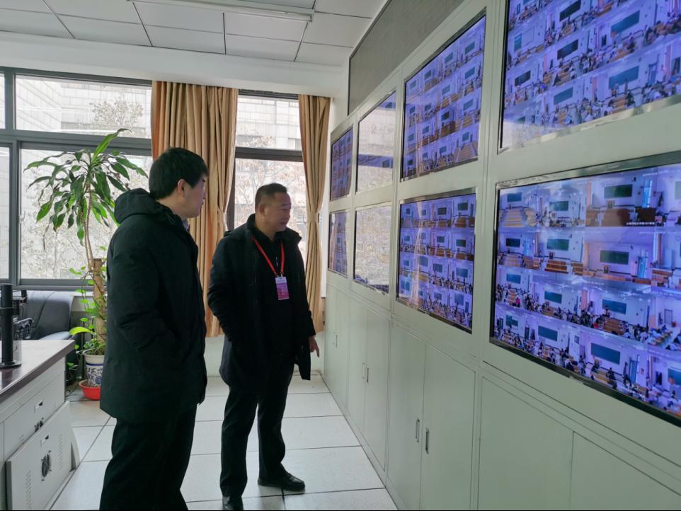 佟德志对考试组织情况、考场环境布置、监考教师配备和学生考风考纪进行仔细巡查,在教室中控室全面查看各考场考试秩序,听取教务处负责人对本学期期末考试整体情况汇报。