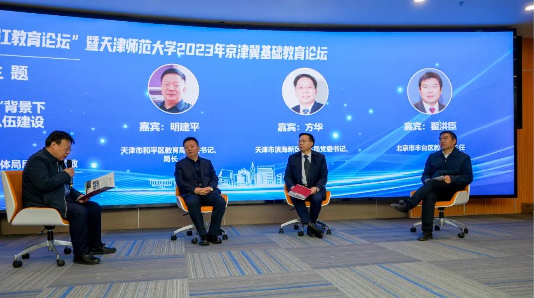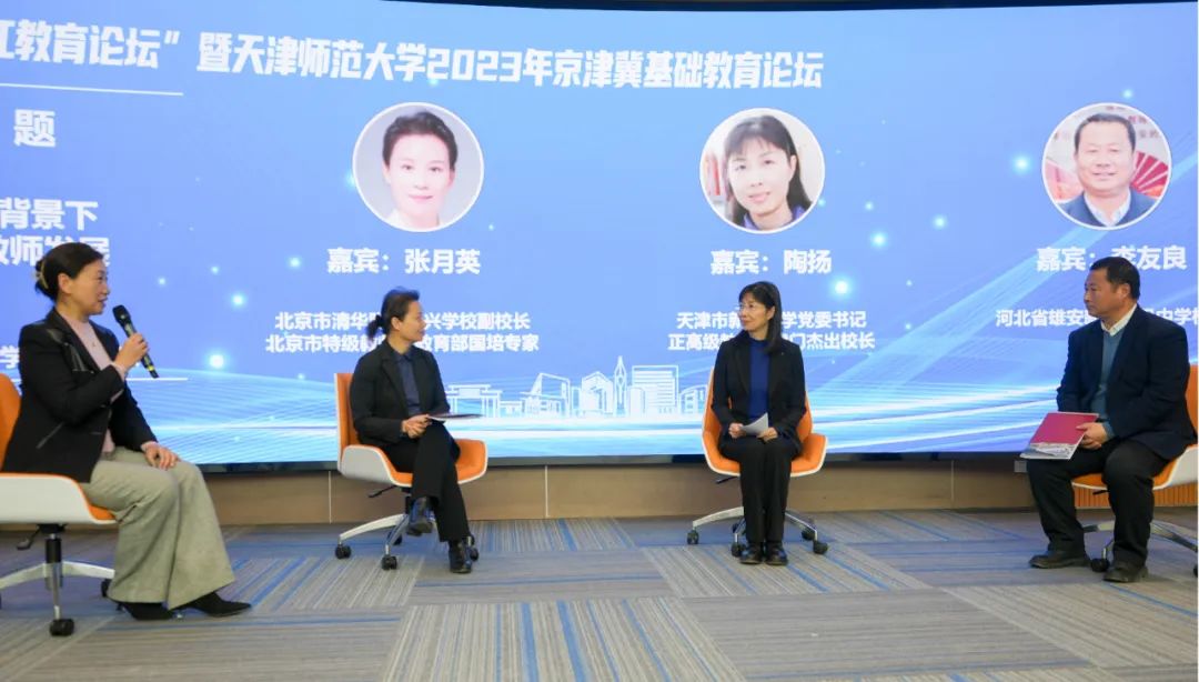 高端对话环节由京津冀教育局长高端对话、京津冀中小学校长高端对话两个环节组成。天津市滨海新区教育体育局党委书记、局长方华,天津市和平区教育局党委书记、局长明建平,河北省承德市围场满族蒙古族自治县教育和体育局局长康学敏,北京市丰台区委教工委委员、丰台区教委副主任翟洪臣交流三地教师队伍建设的经验。河北省雄安新区雄县中学校长李友良、天津第二中学校长高欣、天津市新华中学党委书记陶扬、清华附中大兴学校副校长张月英交流了京津冀三地人工智能促进教师专业化发展方面的经验。
