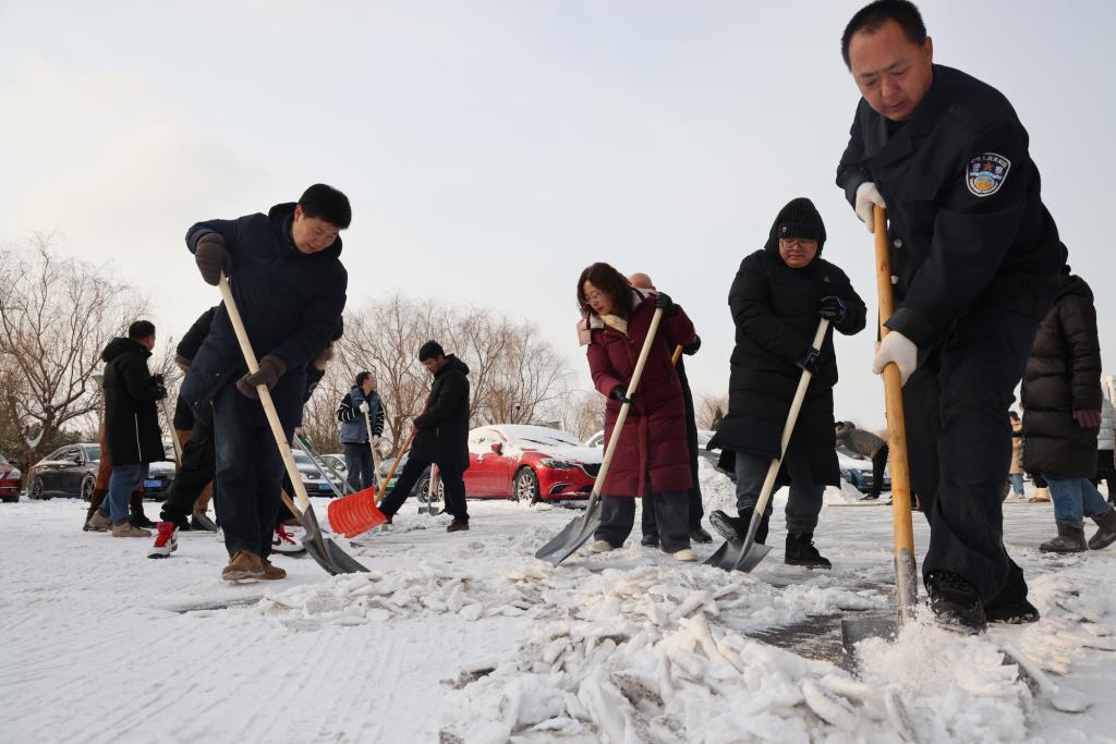 除雪现场,师生们化身校园“守护者”,纷纷行动起来,不怕苦不怕累,大家团结协作、互帮互助,手持推雪铲、铁锹等工具,有序地清理道路积雪、铲除路面结冰。师生们热火朝天地忙碌着,用火热的情怀为冬日校园增添了一股暖流,为全校师生的安全出行提供了保障。