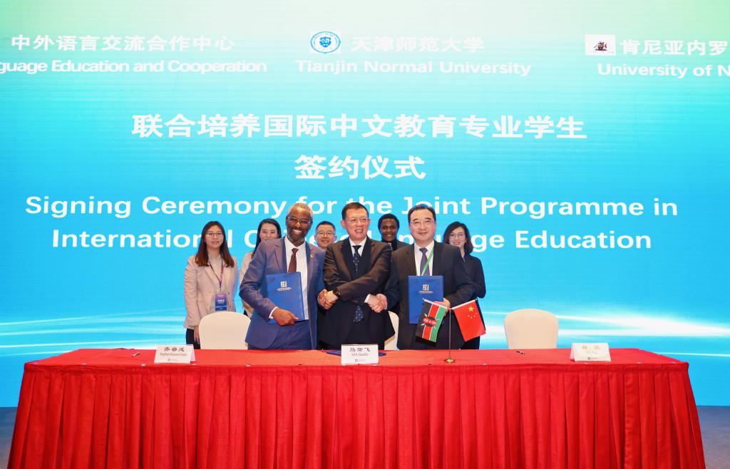 12月8日,大会举行教育部中外语言交流合作中心与中外大学联合培养国际中文教育(中文)专业学生签约仪式,曲凯代表我校与教育部中外语言交流合作中心主任马箭飞、内罗毕大学校长齐睿成签署国际中文教育专业联合培养三方协议。签约仪式在国家会议中心三层会议厅举行。