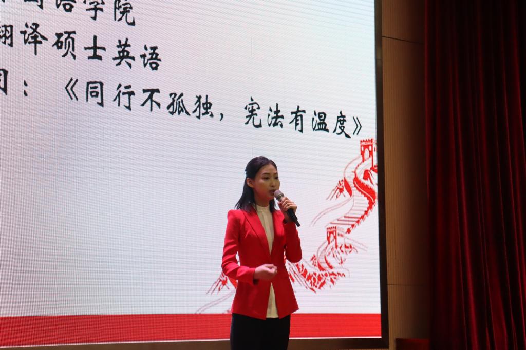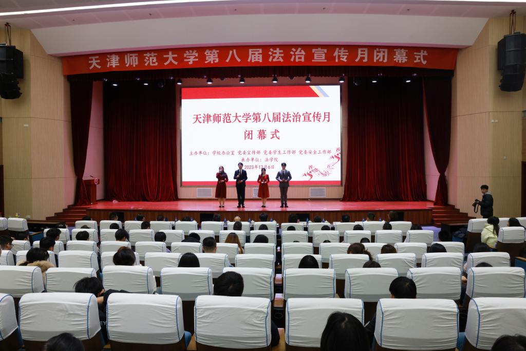 闭幕式上,与会领导公布了我校第六届学生“学宪法 讲宪法”主题演讲比赛获奖名单和优秀组织单位,并为获奖者颁发了荣誉证书和纪念奖品。外国语学院许若晴、政治与行政学院张锐超作为优秀选手代表进行精彩展示。大家以视频的形式回顾了法治宣传月期间开展的丰富多彩的活动,观看了我校与西青区人民检察院合作拍摄的防电信诈骗短视频《送你一双火眼金睛》、“防范非法校园贷”主题原创短剧《金色余晖》以及由校园监控录像改编的交通安全警示教育片。