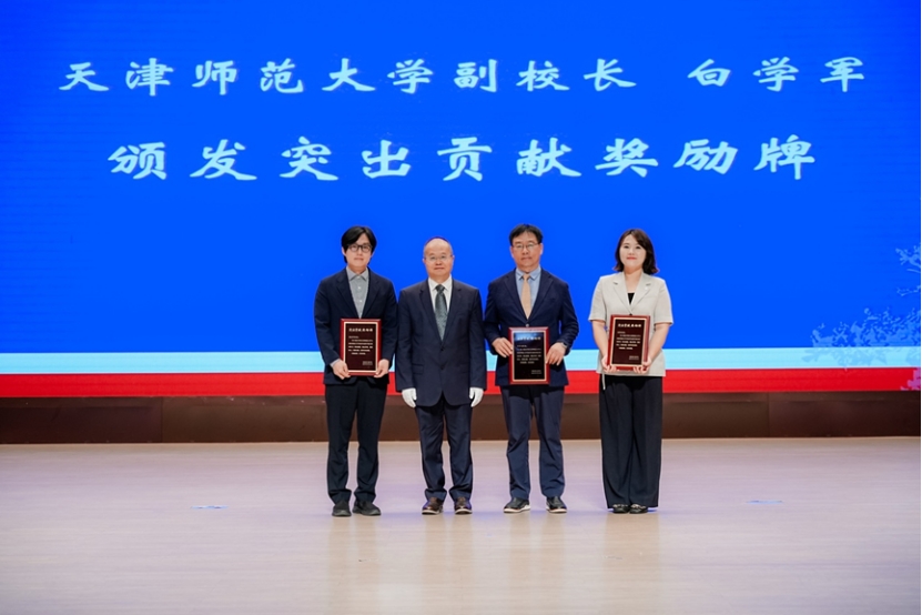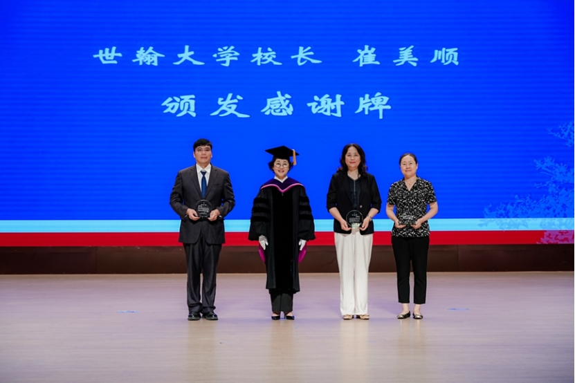 崔美顺向我校管理学院党委书记张庆红、教育学部纪委书记裴巧玲、国际教育交流学院副院长徐雷颁发感谢牌;副校长白学军向韩国世翰大学情报学专业、教育学专业教授颁发突出贡献牌。