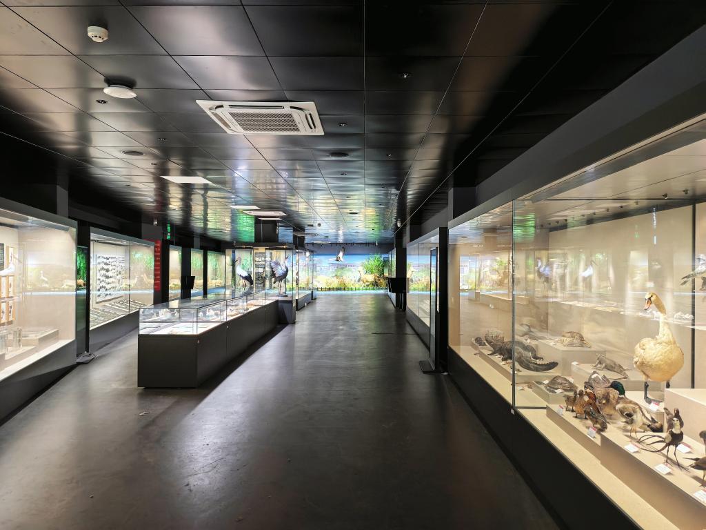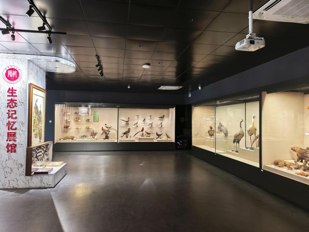 展馆分区科学合理,功能互补,为不同受众提供深度的学习与体验环境。展览区以生物标本陈列与数字化交互模式展出有国家一级保护动物麋鹿、东方白鹳、白枕鹤等。科普教室配备专业音响设备与高清投影系统,可容纳百余人,可开展学术讲座、科普宣讲与专题研讨等活动。实践体验区配备各类显微镜、超净工作台及恒温培养箱等实验设备,可支持动植物标本制作、组织培养、微生物培养、基因克隆等实验实践活动。活体饲育区养殖保育30余种动物,包括昆虫、蜘蛛、甲壳类、鱼类、两爬类、鸟类和哺乳类等观赏动物,通过与活体动物的互动,进一步提升科普教育的感染力与实效性。文创区将生物学元素,如动植物形态、细胞结构、DNA序列、微生物图案、羽毛等与文化艺术设计相结合,开发了兼具科普价值、艺术美感和商业价值的点翠、螺钿、胸针、水墨蝶羽等创意产品。