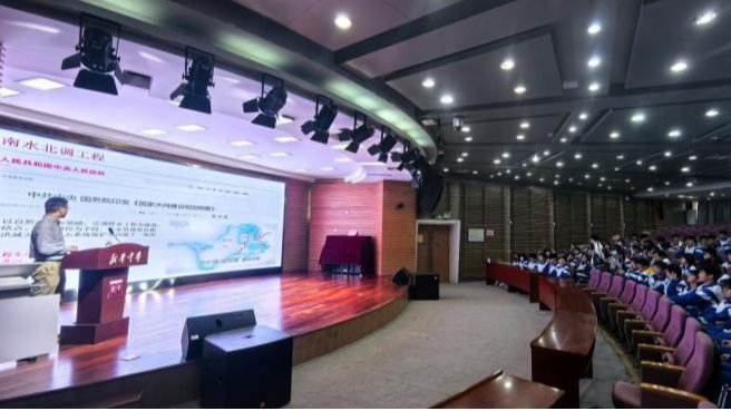 张兵老师以《解密水循环 珍惜水资源 共筑水安全》为题,为新华中学师生带来一场深入浅出的科普讲座。他从地球系统科学切入,以同位素示踪技术解密水的“前世今生”;通过全球淡水分布数据,揭示我国水资源“总量多、人均少、分布不均”的严峻现实;更以天津为例,展现南水北调工程如何让一座“干渴之城”蜕变为“河湖复苏、候鸟云集”的生态典范。从“水往高处流”的东线工程奇迹,到白洋淀“荷塘苇海”的生态重生,再到天津河湖水面十年增加131平方公里的治理成效……科学与情怀交织,让抽象的“水安全”化为可触可感的家国成就。讲台下,学生们认真做着这份特殊的思政笔记:“每一滴水,都是中国智慧的结晶。”