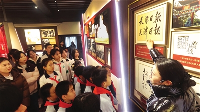 同学们参观毛泽东同志题写的“天津日报”报头复制品。