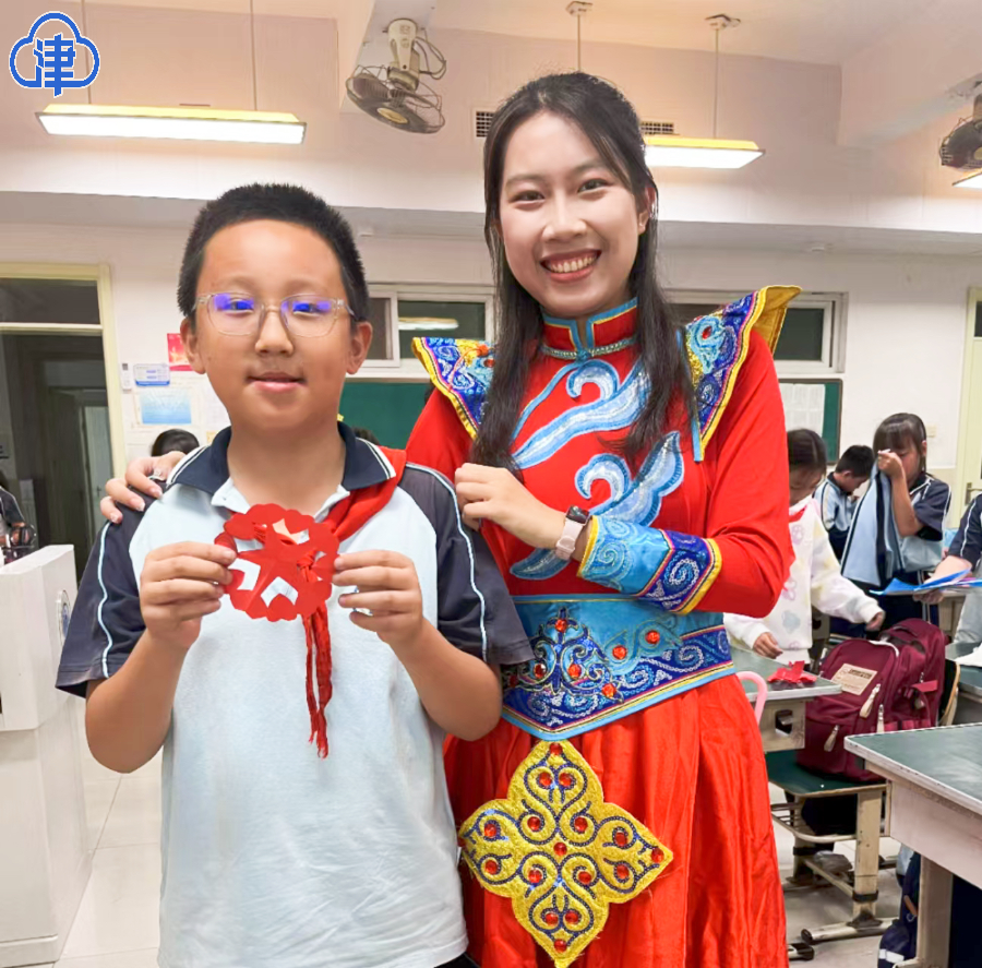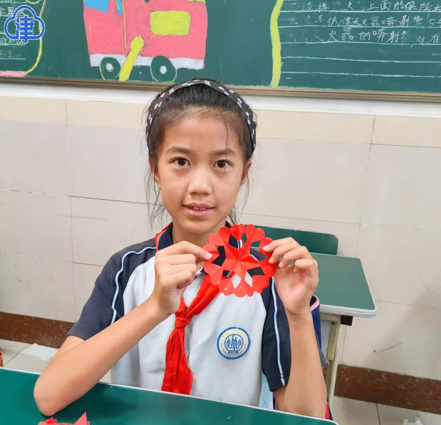在一支优美动人的维吾尔族舞蹈结束后,志愿者们将剪纸技艺搬进了小学课堂。小朋友们拿起剪刀,与志愿者们共同绘制并剪出石榴和天安门的图案。丰富多彩的文化通识体验课程让中华民族共同体意识深深植根于孩子心中,不断提升孩子们热爱祖国的真挚情感,激发民族自豪感。