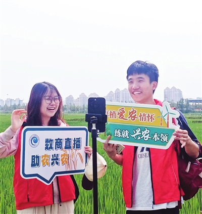 实践团学生化身网络主播,在乡间稻田架起手机,以“故事讲述+产品介绍”形式,面对镜头推介稻米等当地特色农产品。