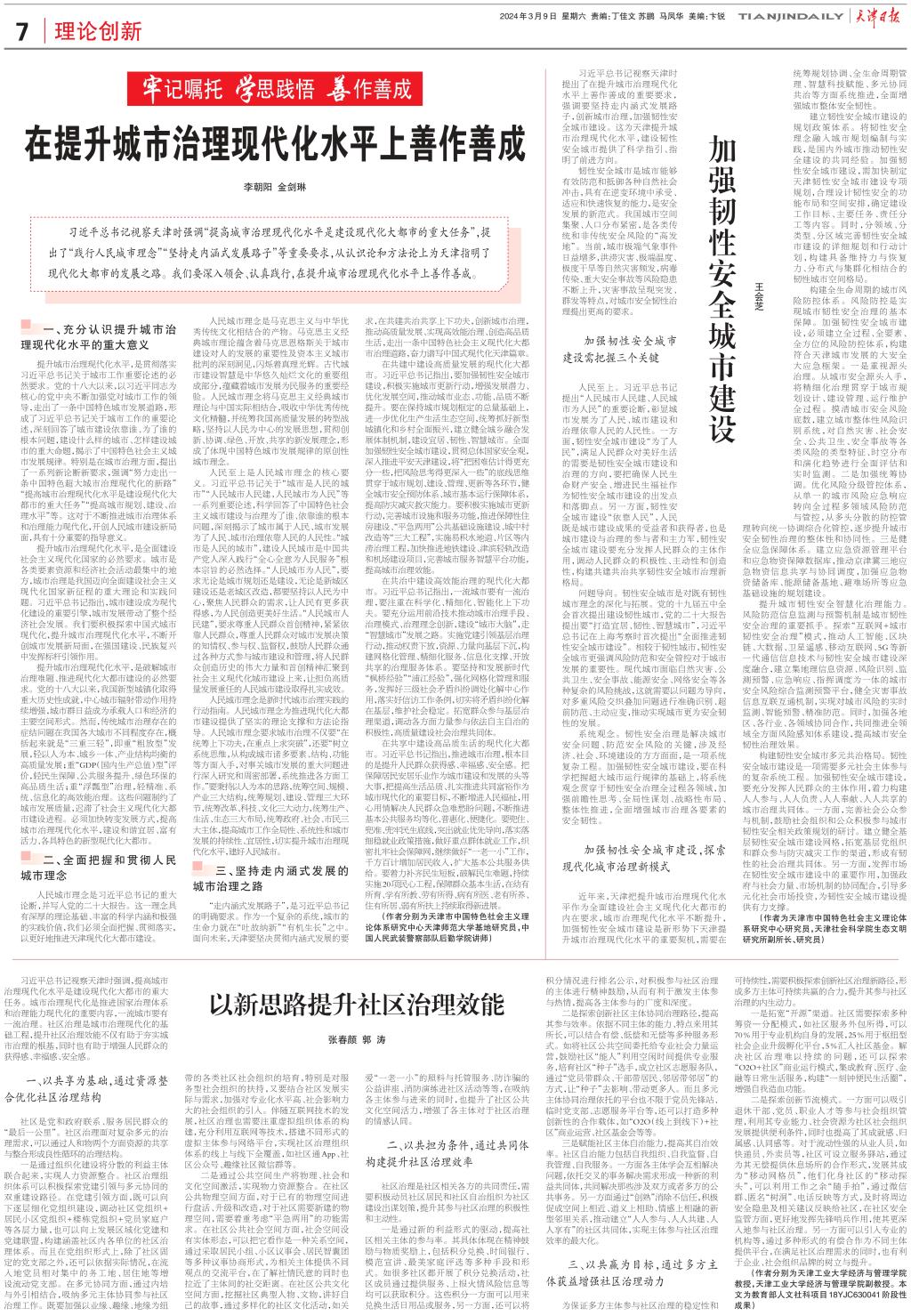 在共建中建设高质量发展的现代化大都市。习近平总书记指出,要加强韧性安全城市建设,积极实施城市更新行动,增强发展潜力、优化发展空间,推动城市业态、功能、品质不断提升。要在保持城市规划框定的总量基础上,进一步优化生产生活生态空间,统筹抓好新型城镇化和乡村全面振兴,建立健全城乡融合发展体制机制,建设宜居、韧性、智慧城市。全面加强韧性安全城市建设,贯彻总体国家安全观,深入推进平安天津建设,将“把困难估计得更充分一些,把风险思考得更深入一些”的底线思维贯穿于城市规划、建设、管理、更新等各环节,健全城市安全预防体系、城市基本运行保障体系,提高防灾减灾救灾能力。要积极实施城市更新行动,完善城市设施和服务功能,推进保障性住房建设、“平急两用”公共基础设施建设、城中村改造等“三大工程”,实施易积水地道、片区等内涝治理工程,加快推进地铁建设、津滨轻轨改造和机场建设项目,完善城市服务智慧平台功能,提高城市治理效能。