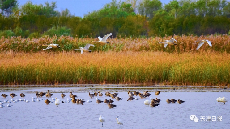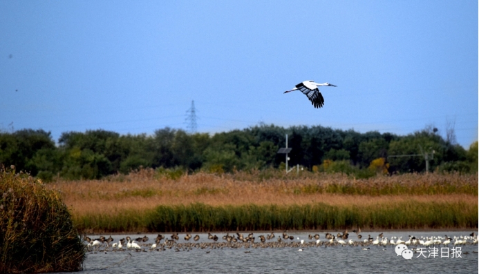 “看,麋鹿来啦!”说话间,远处芦苇荡出现了一群膘肥体壮的“四不像”。“一共有9头麋鹿,这是一个小群落。长着鹿角的是成年雄鹿。”站在苇塘边,赵大鹏介绍,“七里海湿地是麋鹿的天然食堂,良好的生态环境带来丰富的食材。研究麋鹿的食性和食谱对于保护这个物种至关重要。据七里海湿地自然保护区工作人员观测,目前的麋鹿种群已达到31头。”七里海湿地是“东亚—澳大利西亚迁飞区”候鸟迁徙路线的重要停歇地。生态环境好不好,鸟儿会用翅膀来“投票”。据七里海湿地自然保护区工作人员观测,当日已经有上万只候鸟飞临七里海湿地,其中,东方白鹳、天鹅、白琵鹭等珍稀鸟类超过2000只。