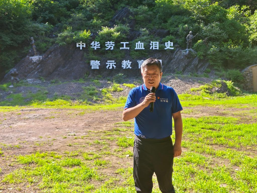 在中华劳工血泪史警示教育园的草棚党课中,蓟州区委党校副校长刘闫明为大家讲述了中华劳工被掳掠、奴役的苦难历史,他哽咽地讲道:“如此累累的恶行,我们不能忘、不敢忘、不会忘,我们广大党员更要以记忆为火种,点亮祭奠的长明灯,熔铸成守护未来的钢盾。”学院党委副书记、院长郝磊讲道:“无数的革命先辈们用他们的鲜血和生命,筑起了‘抗战精神’的丰碑,当我们在讲授《中华人民共和国民法典》第185条‘英雄烈士保护条款’时,便能深刻感受到条文背后跳动的历史脉搏,我们要将先烈们用生命书写的‘抗战精神’,转化为建设新时代法学院的澎湃动力,为学院的发展建设贡献力量。”