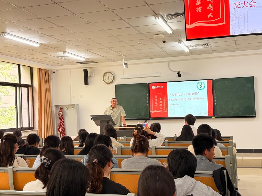 在经验交流环节,三位成功考取研究生的优秀学生代表带来精彩分享。考取湖南大学的贺罗姿讲解了如何高效地安排时间和调整心态。考取天津大学的鲁欣然着重介绍了备考方法和答题技巧。考取中山大学的余亦淇聚焦“差异化备考策略”,针对不同类型院校考核特点提出定制化解决方案。