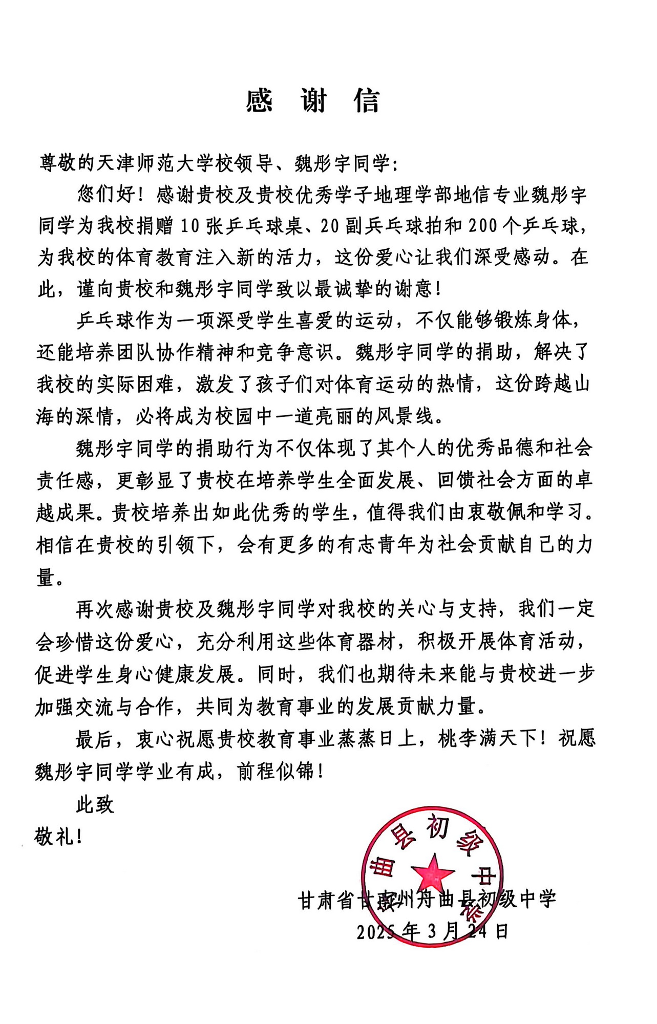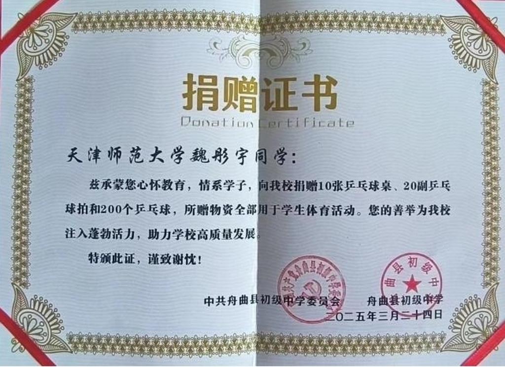 在家人支持下,魏彤宇决定将积攒的实习收入用于购置体育用品捐献给甘肃省甘南州舟曲县初级中学,10张崭新的乒乓球台、20副乒乓球拍、200个乒乓球于2025年3月悉数到达舟曲初中,为该校体育教育注入新的活力。这一善举并非一时兴起,而是源于魏彤宇自加入中国青年志愿者协会以来多次参与志愿活动得到一些体会:体育不仅是强健体魄的载体,更是锤炼意志的熔炉;教育帮扶需要的不仅是物资,更需长久的关注与温度。一张球台,或许能为山区少年推开一扇眺望世界的窗;一次行动,亦能传递教育公平的薪火——师范学子不仅是知识的接受者,更应成为进一步促进实现教育公平的践行者、教育温度的传递者。