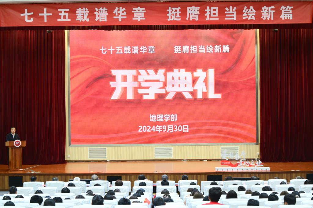 地理学部党委书记苏睿先在致辞中对411名2024级新生的到来表示热烈的欢迎,并介绍了学部在人才培养、学术科研、社会服务等各方面取得的成绩和进展,激励同学们认真贯彻落实党的二十届三中全会精神和全国教育大会精神,做心怀家国、志向远大,敢作敢为、善作善成,坚持自省、立身守信的地理人,在认识自我中敢于造梦,在追求自我中勇于追梦,在超越自我中勤于圆梦,奏响“请党放心、强国有我”的青春之歌!