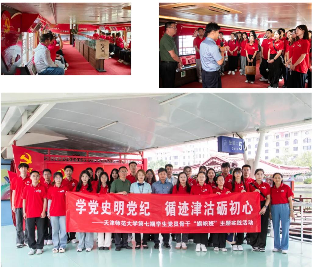 杨琥带领师生由海河古文化街码头的“海河红船”出发,结合船上设立的“海河上的天津红色记忆展”,介绍各类史料照片、珍贵展品及海河两岸景物,生动讲述了天津红色遗迹故事和历史风貌建筑背后的家国情怀,他勉励师生党员不忘初心、牢记使命,继承革命先烈遗志奋发成才,建设天津,服务人民,报效祖国。