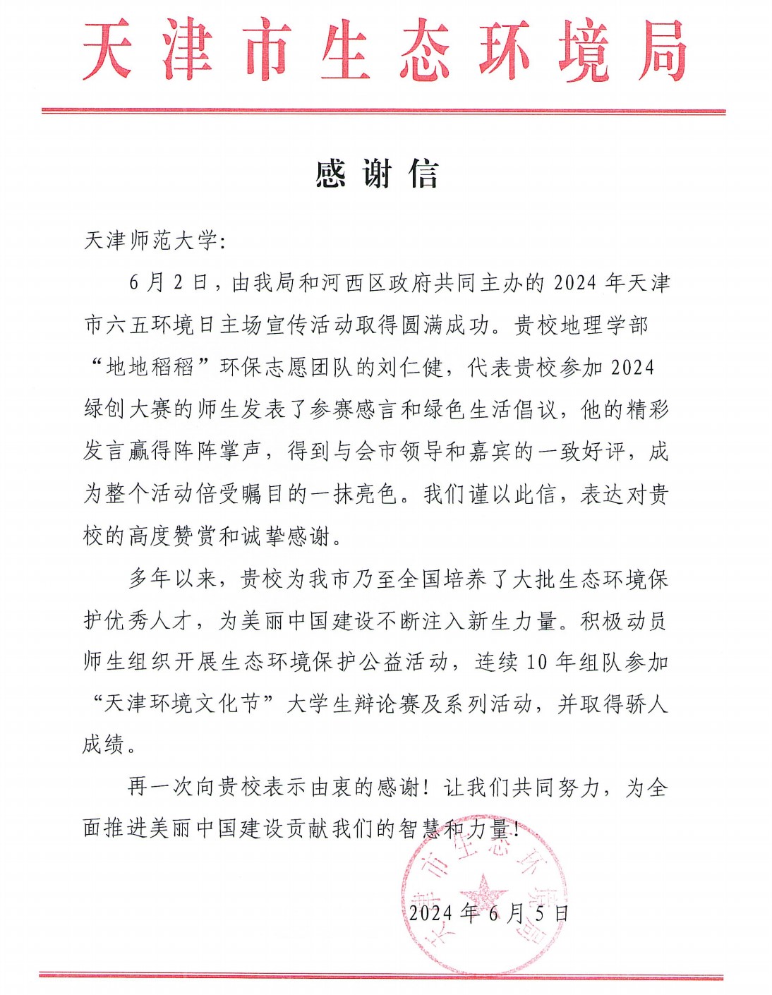 地理学部消息(通讯员 巴增胜)6月2日,天津市生态环境局和河西区政府共同主办的2024年天津市六五环境日主场宣传活动取得圆满成功。天津市生态环境局发来感谢信,对我校地理学部2023级地理科学(师范)专业本科生刘仁健同学提出表扬,并向我校长期以来对生态环保工作的大力支持和人才培养方面的突出贡献表示感谢。