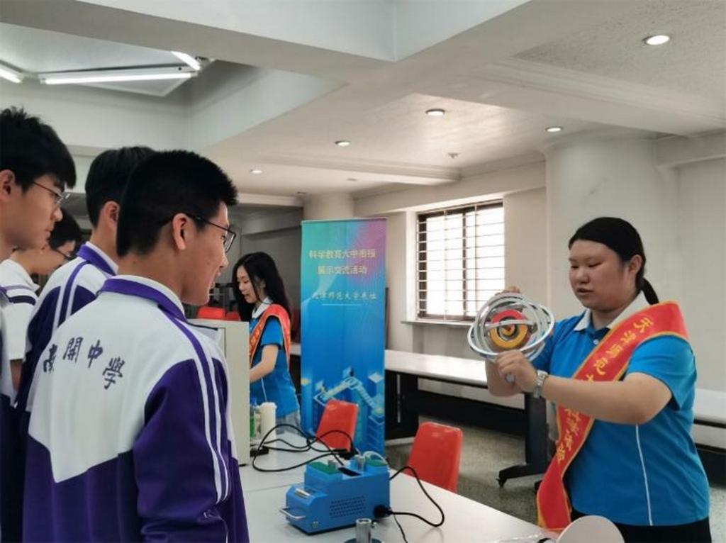 党员们走进南开中学,通过茹可夫斯基凳、角动量守恒转台等先进的实验教学仪器为高一高二年级学生带来了一场热烈的头脑风暴,使中学生感受身边科学之美。