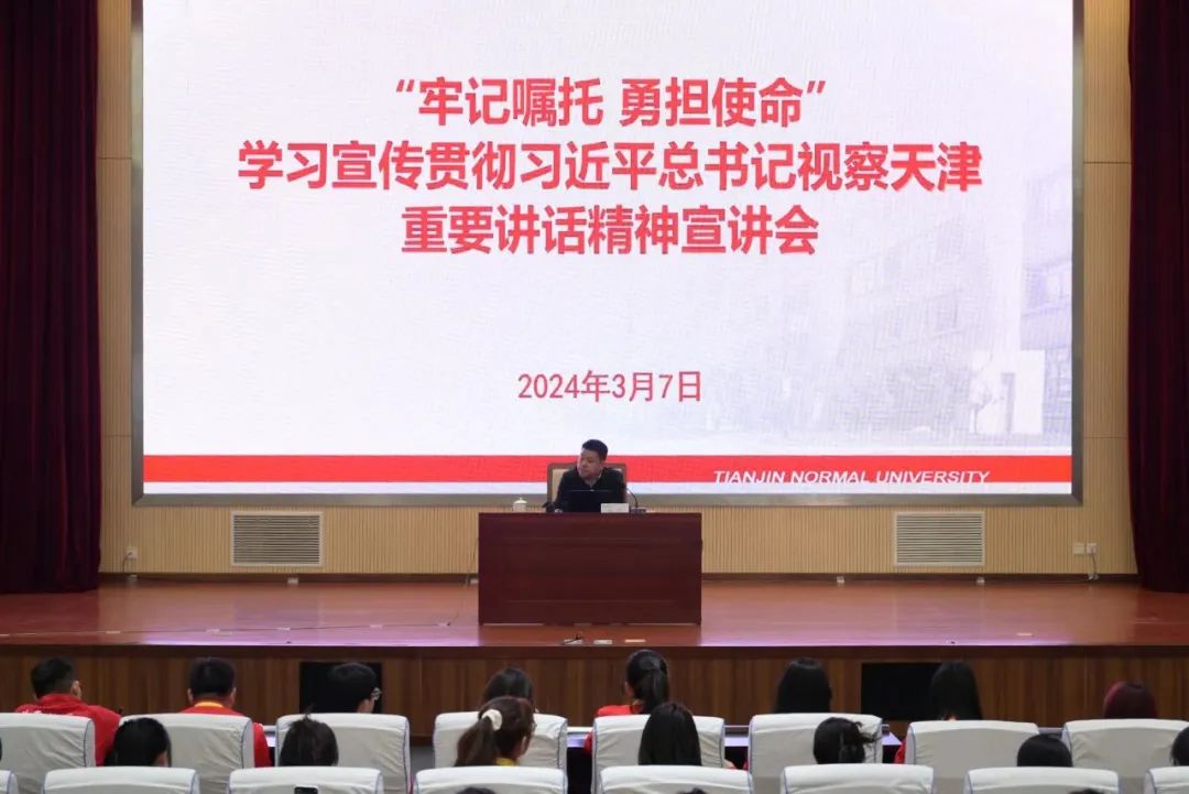 校团委消息(通讯员 孟亮)为深入学习宣传贯彻习近平总书记视察天津重要讲话精神,激励我校广大团员青年坚定信心决心,感恩实干奋进,3月7日下午,校团委组织全校基层学部(院)团委书记、校青马班学员、校院两级团学骨干共计300余人召开“牢记嘱托 勇担使命”学习宣传贯彻习近平总书记视察天津重要讲话精神宣讲会。会议邀请中共天津市委党校公共管理教研部刘学副教授做专题报告。