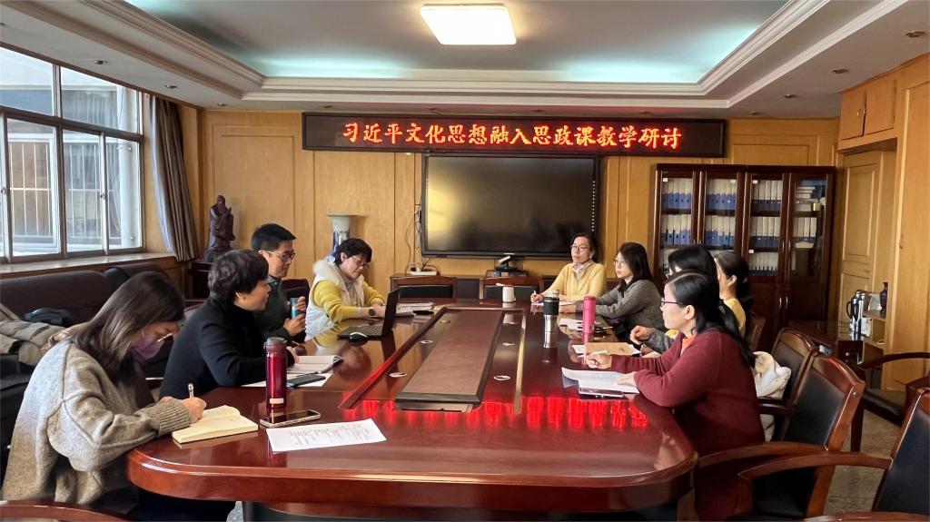 思政教研室教师结合自己的学习体会,畅谈理论学习的收获以及将其融入思政课教学的思考和实践探索。思政课教师、副院长苏爱洁教授分享了在《习近平新时代中国特色社会主义思想读本》课相关章节教学时,如何把握“文化自觉——文化自信——文化自强”脉络,将习近平文化思想融入教学,实现在学生心中厚植文化自信、文化自强的教学目标。思政课教师、教务科副主任贺溪结合网络视频《逃出大英博物馆》,分享了将传承中华民族优秀文化融入《形势与政策》课教学,激发学生爱国之情和报国之志的过程。