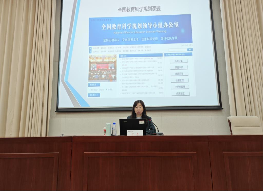 天津市教科院教育法治与发展规划研究所所长方芳研究员分享了全国教育科学规划课题的申报经验。她从申报人的角度全面分析了全规办六类课题的选报经验,要根据国家需求与政策导向确定选题,好的选题需要申报人认真研判选题指南,要有超前预判意识,及时关注时事热点,既要突出学科性,又要找到最佳契合点。她以自身为例详细剖析了“发现选题-确定选题方向-最终确定题目”的三大阶段,同时为申报人如何从客观和主观两个方面对课题可行性论证提供了思路和方法。