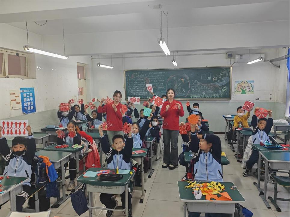 在《妙剪生花》课堂上,志愿者们为同学们普及了“剪纸文化”在实际生活中的应用场景以及剪纸艺术的由来和发展历史,随后带领小朋友们一起完成剪纸作品创作,让大家在实操过程中沉浸式感受中华传统文化的魅力所在。