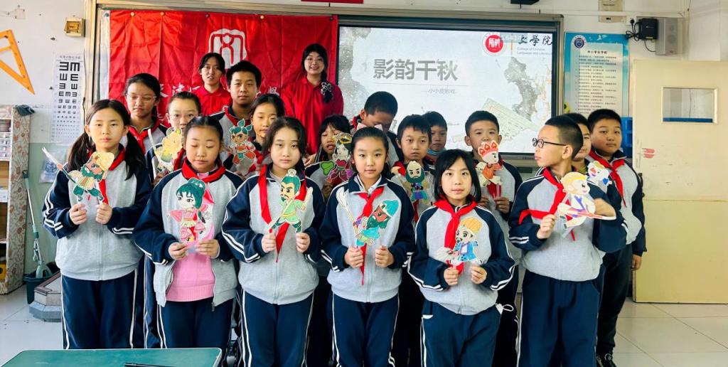 在《影韵千秋》课堂上,志愿者们首先通过播放影音资料激发学生们对皮影戏的兴趣,让他们了解皮影戏的发展历程,随后通过对比不同流派对经典神话故事《三打白骨精》的演绎,让大家了解不同流派之间唱腔、鼓法的区别。