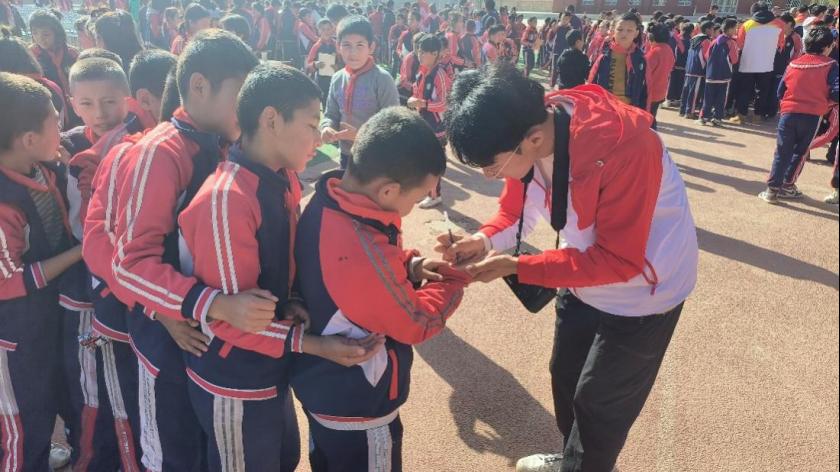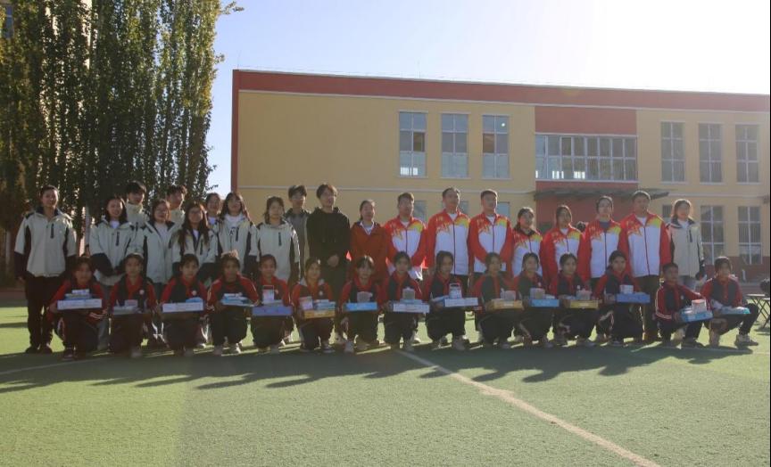 支教团为小学生送上丰富的科学实验套装、彩笔等礼物,希望他们努力学习科学文化知识,用自己的双手绘制出未来的精彩人生。策勒县教育局及受捐学校为师生赠送锦旗表达由衷的敬意和感谢。