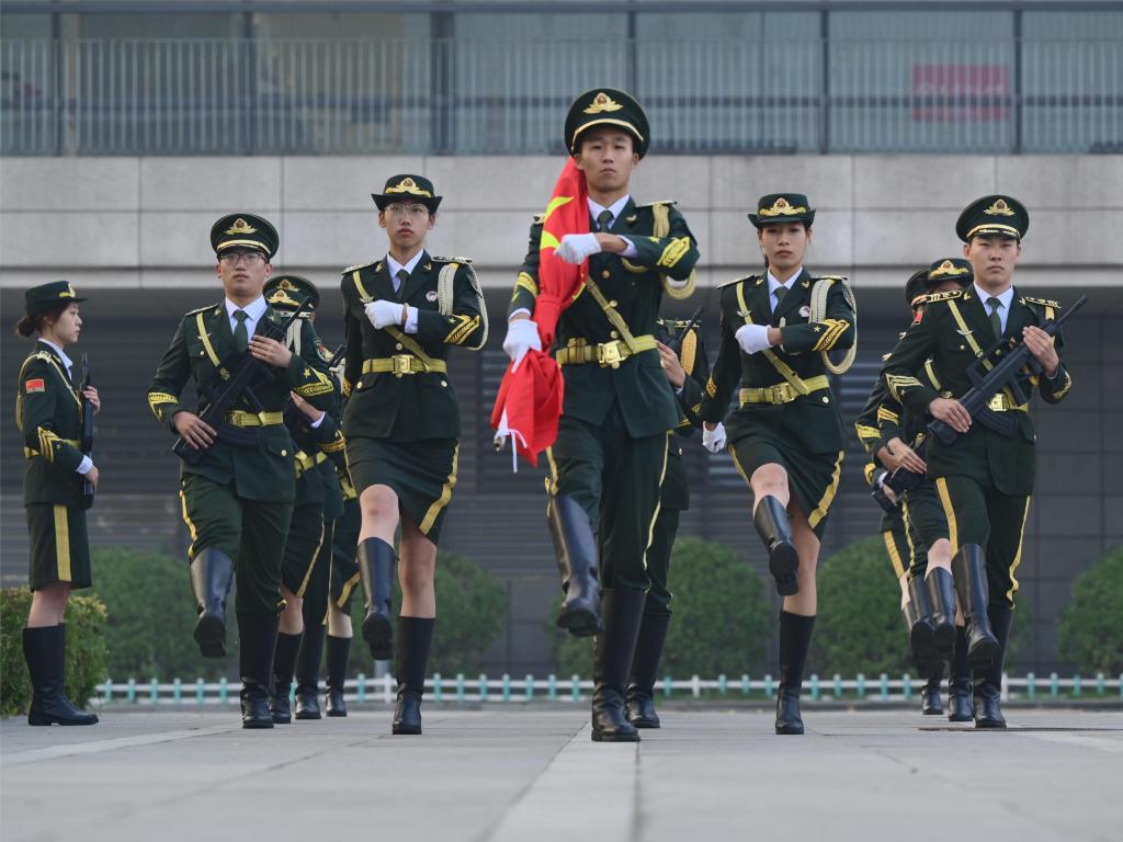 早7时,英姿飒爽的国旗护卫队员们迈着铿锵有力的步伐护卫国旗入场。在雄壮的国歌声中,五星红旗冉冉升起,在晨曦中迎风飘扬,全场师生齐唱国歌,向国旗行注目礼。