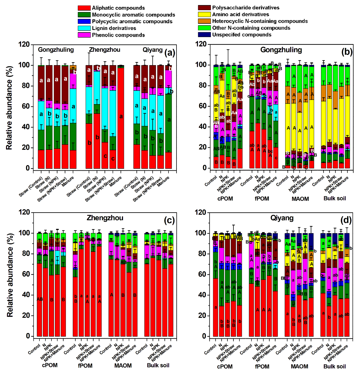 土壤有机质(SOM)的化学组成是其稳定性和功能的基础。然而,在气候梯度下,长期施肥如何影响土壤有机质的分子组成尚不清楚。本研究选取我国南北气候梯度(温度和降水等)下的三种典型土壤:黑土(寒温带)、潮土(暖温带)和红壤(亚热带),基于热裂解—气相色谱/质谱技术,研究了粗颗粒有机质(cPOM,250-2000μm),细颗粒有机质(fPOM,53-250μm)和矿物结合有机质(MAOM,<53μm)在五种施肥处理下的分子组成。研究结果表明:(1)三种土壤的SOM分子组成有显著差异,黑土含有更多的含氮化合物,而潮土含有更多的脂肪族化合物;(2)对于黑土和红壤,粒径大小而非施肥方式是SOM分子组成的主要影响因素,芳香族化合物和木质素衍生物选择性地保留在颗粒态有机质(POM)中,而含氮化合物主要富集在MAOM中;(3)对于潮土,不同粒级之间的SOM分子组成差异不显著。综上所述,在气候梯度下,土壤类型而非施肥方式,决定了土壤有机质的分子组成。此外,SOM分子组成在物理尺寸上的空间差异与土壤质地有关,在粘土和粘壤土中差异较大,但在砂质壤土中差异较小。