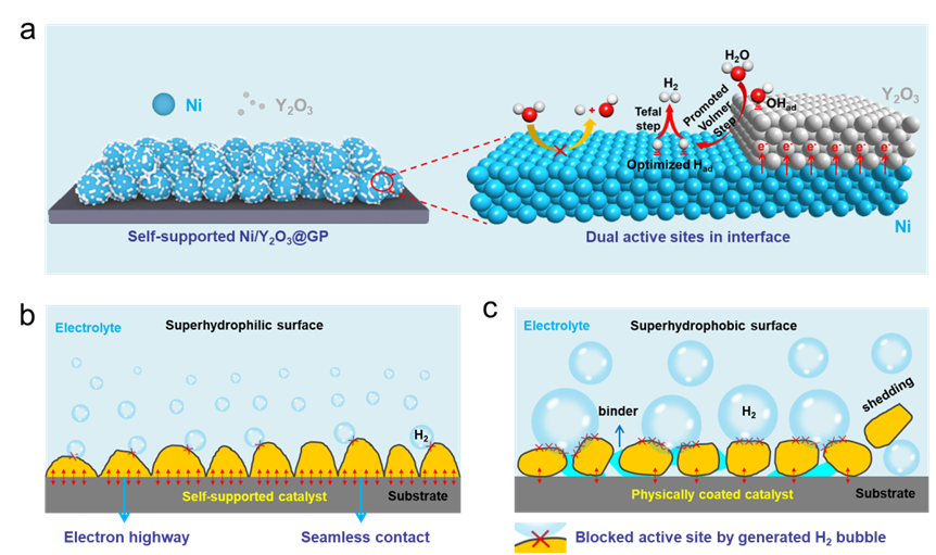 这项工作利用选择性高温还原的方法制备了一系列金属镍/稀土金属氧化物(Ni/Sc2O3、Ni/Y2O3、Ni/La2O3)复合电极。稀土金属氧化物(Sc2O3、Y2O3、La2O3)的掺入显著提升了金属镍的碱性析氢催化性能,其中,由于Y2O3具有较适中的亲氧性,不仅减低了水分解能垒,促进碱性HER的Volmer步骤,而且防止了生成OH的毒化,因此Ni/Y2O3电极表现出了最优异的析氢催化活性。Ni/Y2O3电极的自支撑电极结构增强了催化剂-基底的粘附力,确保了大电流密度下的快速电子传输和催化剂结构稳定性。超亲水的电极表面减弱了催化剂-气泡之间的粘附力,促进气泡在小尺寸的时候快速脱落,减少了催化“死区”的产生,促进了催化剂大电流密度下活性位点的暴露,缓解了由于气泡粘附产生的催化剂脱落,提高了稳定性。同时,超亲水的电极结构还可以降低气泡粘附所产生的系统电阻Rs,从而降低气泡引起的过电位。该工作表明超亲水电极结构可以显著提高电极在大电流下的活性和稳定性。