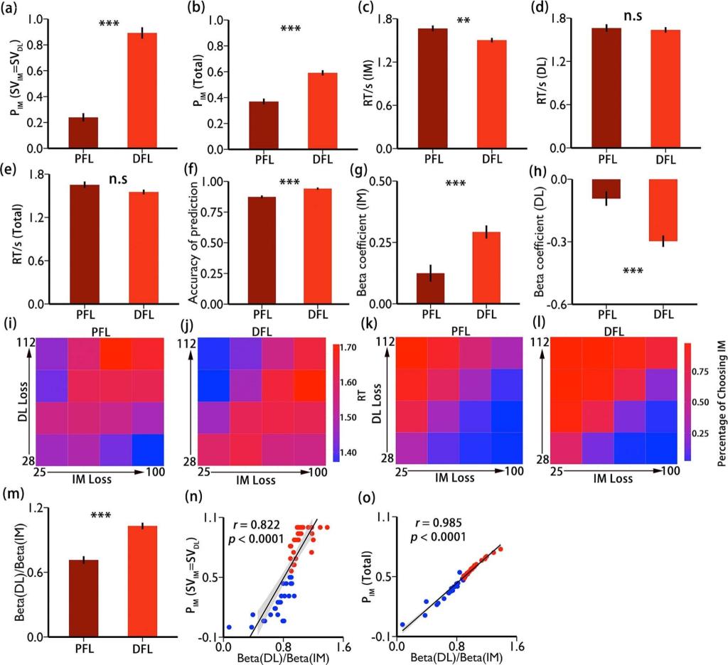 当预期未来损失时,人们会表现出两种截然不同的行为决策模式中的一种:对未来损失的恐惧(dread of future losses,DFL)与相对于眼前损失对未来损失的偏好(preference of future losses,PFL)。为了准确区分个体偏好并揭示背后潜在的神经生物学基础,课题组开发了一种新型跨期选择范式,参数化地操纵了即时损失和延迟损失的大小,构建主观相等的试次。参数回归模型揭示,与 PFL 相比, DFL 表现出对即时奖励损失的低敏感性和对延迟损失的高敏感性,同时在反应时和即时损失相关的选择上表现出不同的行为模式(图1)。其次,该研究直接比较了 DFL 和 PFL 的即时和延迟损失相关神经激活的差异,结果表明 DFL决策偏好可能归因于背内侧前额皮层、顶上回和外侧枕叶皮层区域负责的未来损失主观价值计算的异常所致。