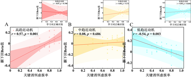 1 不同强度趋近动机积极情绪条件下颞下回激活值与关键诱饵虚报率之间的相关, 其中A) 高趋近动机积极情绪条件, B) 中趋近动机积极情绪条件, C) 低趋近动机积极情绪条件。右上角小图为对应强度趋近动机条件下颞下回激活值与学习词正确识别之间的相关