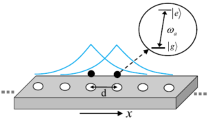最近,随着纳米技术的不断发展,一维波导中量子发射器对光子的散射问题得到广泛研究。一维光学纳米波导系统十分特别,它不仅可以束缚光子,还可以增强光子和量子发射器之间的相互作用强度,这两个特点对于量子信息技术和量子设备应用都是十分重要的。尤其地,由于其独特的结构和新奇的性质,光子晶体波导为探索光子和原子间非线性相互作用提供了新的途径,吸引了人们广泛的关注。当囚禁在光子晶体波导附近的原子被激发且激发频率处在其能带的带隙时,原子自发辐射产生的光子无法在波导中传输。有趣的是,这会在原子附近产生指数衰减的倏逝场,也即形成一个原子-光子束缚态。当囚禁在同一个光子晶体波导的其它原子也处在这个局域的倏逝场内时,人们就获得了可调控的原子间的多体相互作用。基于此,我们研究了一维光子晶体波导中原子二聚体的可调控的量子输运特性。在弱激发状态下,我们给出了缀饰态下的能级分布及其向波导模式的衰退率,这两者都高度依赖于两个原子之间的距离。其中,我们重点关注了布拉格情况和反布拉格情况,存在亚辐射态和超辐射态,并且在共振时可能发生具有